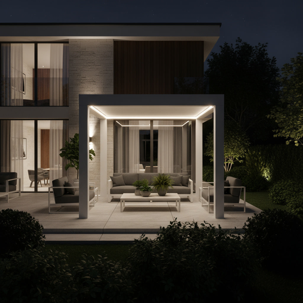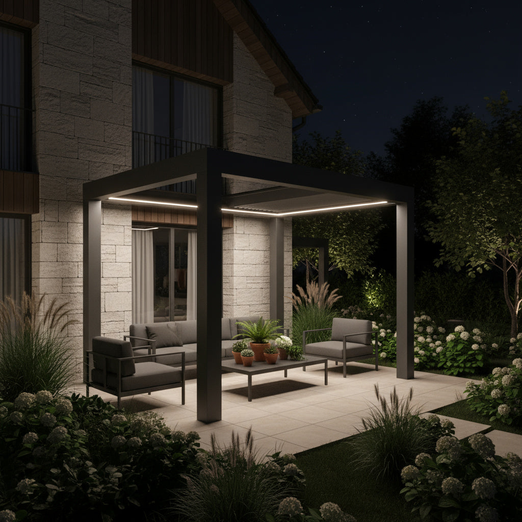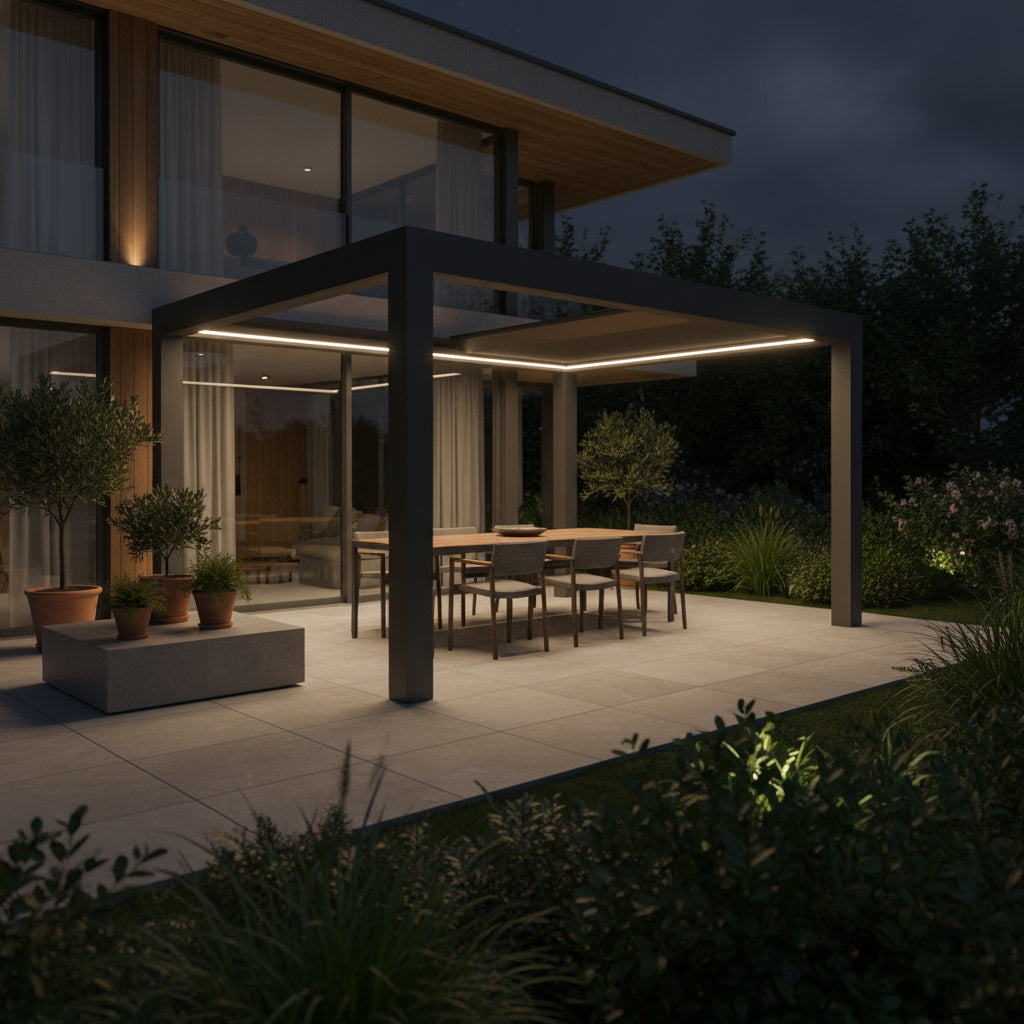 Unsere Pergola ist mit einer eleganten LED-Beleuchtung ausgestattet. Im Rahmen befindet sich eine dimmbare warmweiße LED-Lichtleiste, die eine stilvolle und angenehme Atmosphäre schafft. Die Beleuchtung ist wetterfest, energieeffizient und kann bequem per App, Sprachsteuerung oder Fernbedienung gesteuert werden.