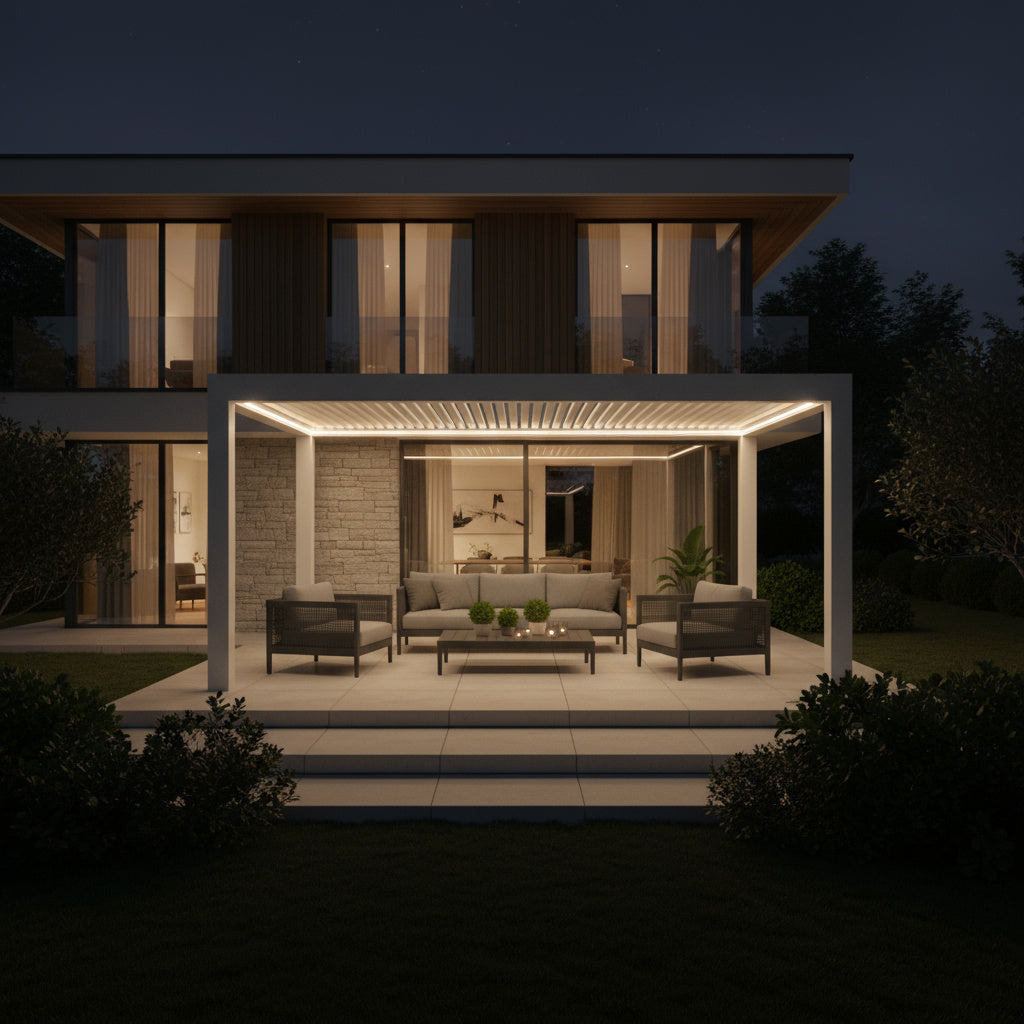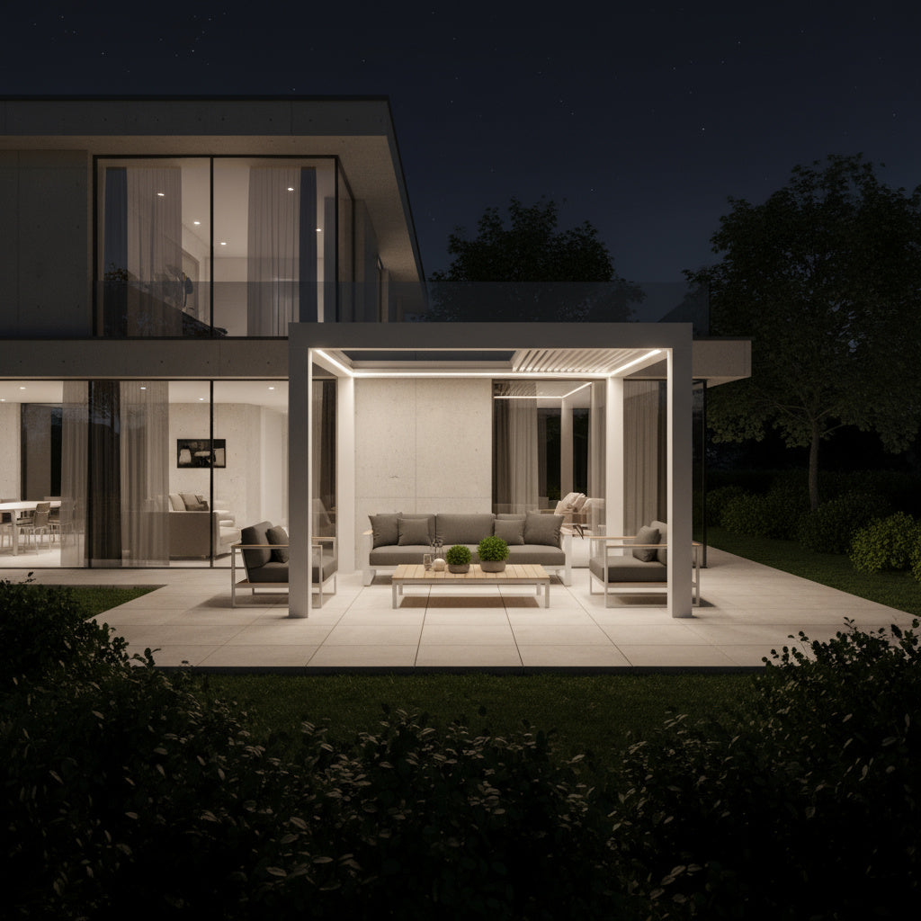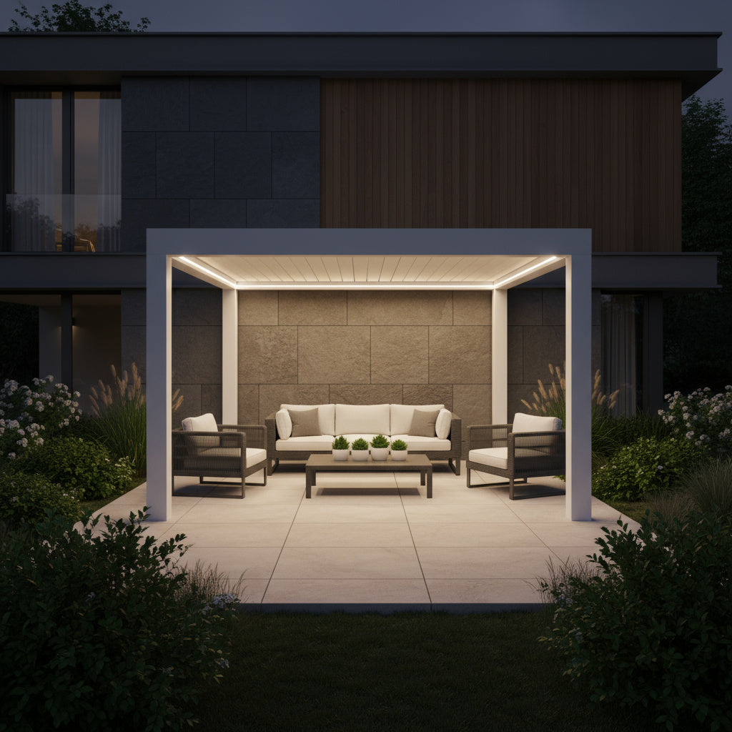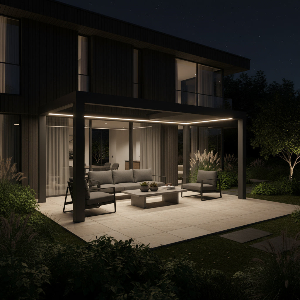 Unsere Pergola ist mit einer eleganten LED-Beleuchtung ausgestattet. Im Rahmen befindet sich eine dimmbare warmweiße LED-Lichtleiste, die eine stilvolle und angenehme Atmosphäre schafft. Die Beleuchtung ist wetterfest, energieeffizient und kann bequem per App, Sprachsteuerung oder Fernbedienung gesteuert werden.