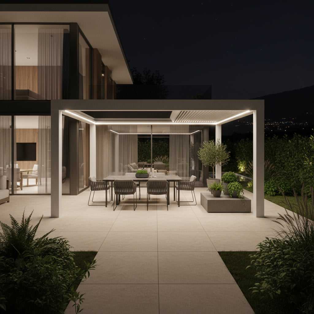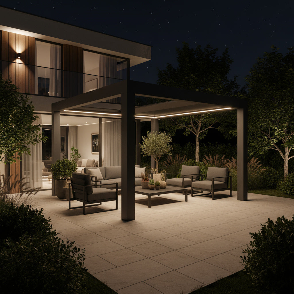 Im Rahmen der Pergola ist eine dimmbare warmweiße LED-Beleuchtung integriert, die für eine stilvolle, stimmungsvolle Atmosphäre sorgt. Wetterfest, energieeffizient und komfortabel steuerbar – per App, Sprachbefehl oder Fernbedienung.