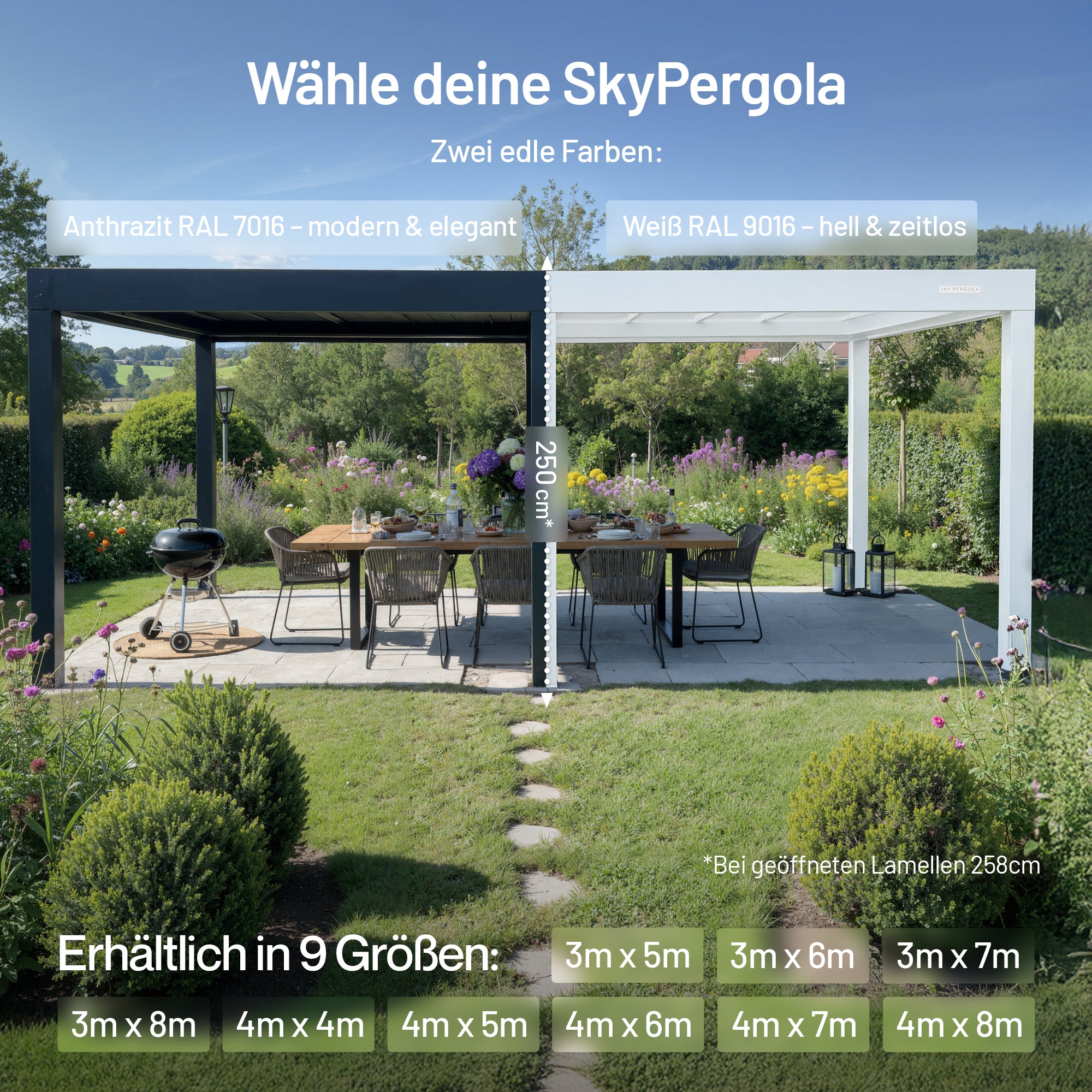 Die Standardhöhe der Sky Pergola beträgt 250 cm. Bei geöffneten Lamellen kommen zusätzlich ca. 8 cm hinzu, sodass die Gesamthöhe in geöffnetem Zustand ca. 258 cm beträgt.
