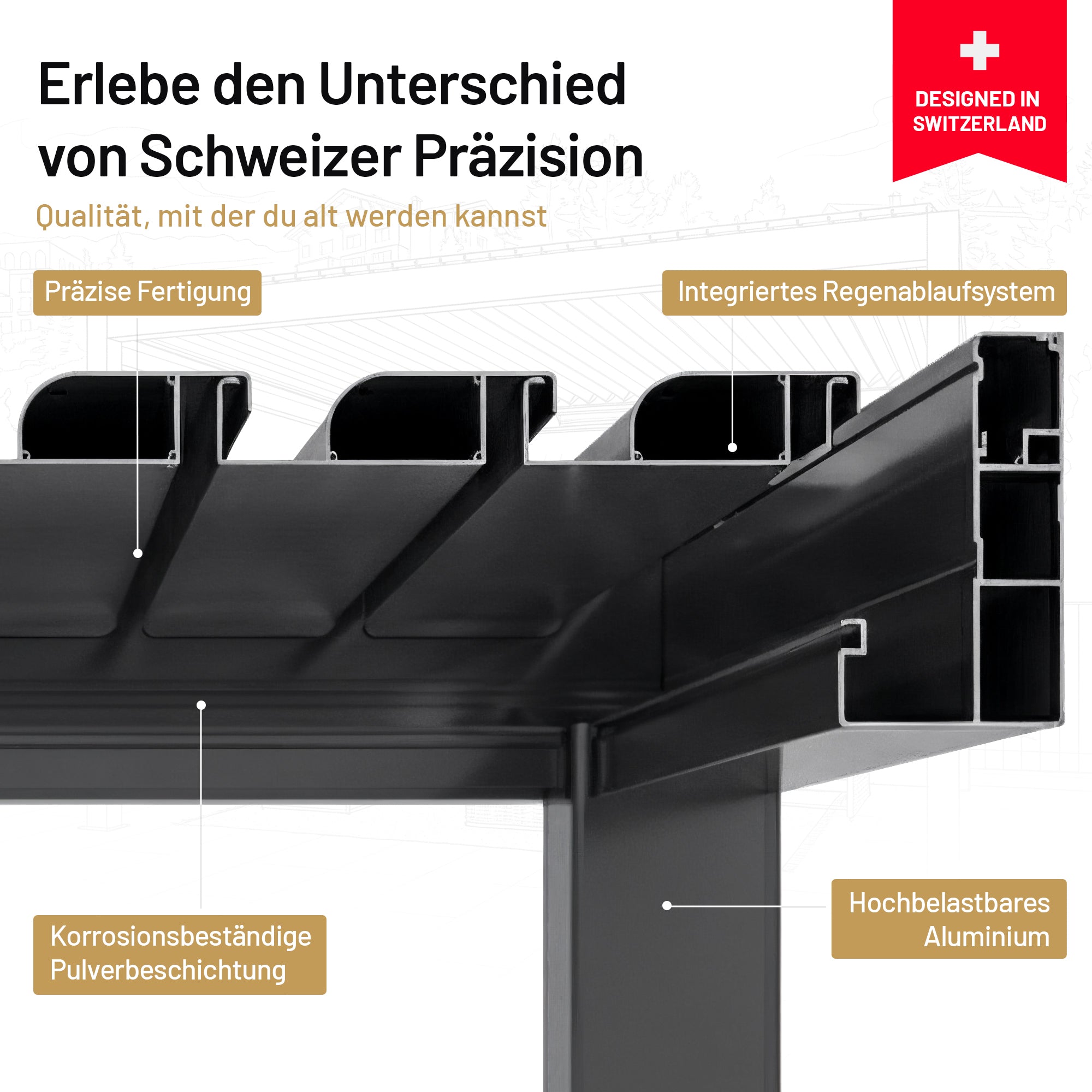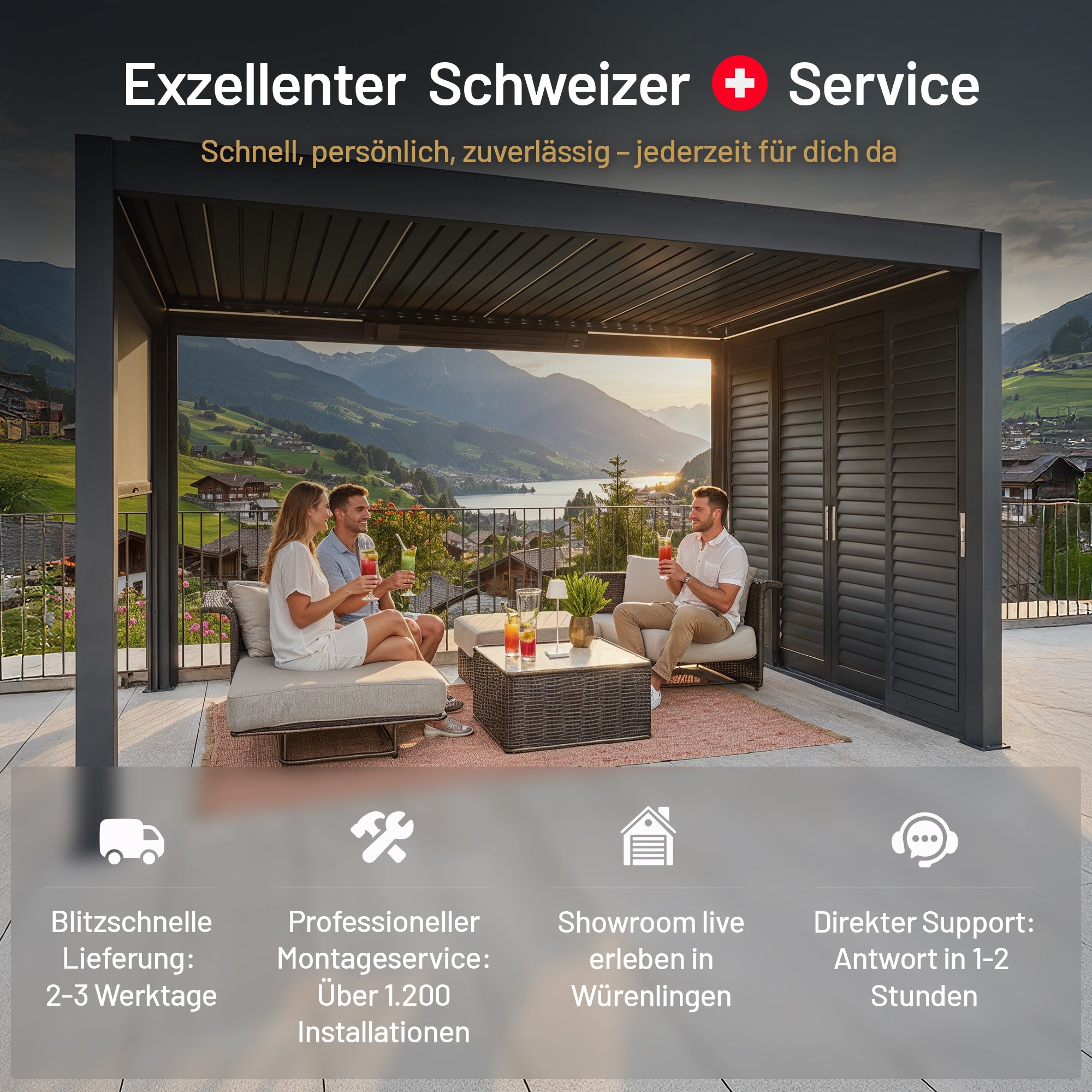 Die Eigenmontage ist dennoch problemlos möglich – unsere Pergolen sind bewusst so konstruiert, dass der Aufbau auch selbst durchgeführt werden kann. Viele unserer Kunden entscheiden sich für die Selbstmontage und sparen dadurch erhebliche Kosten, denn professionelle Montagen können in der Schweiz schnell teuer werden. Bei Fragen unterstützen wir Sie selbstverständlich jederzeit.