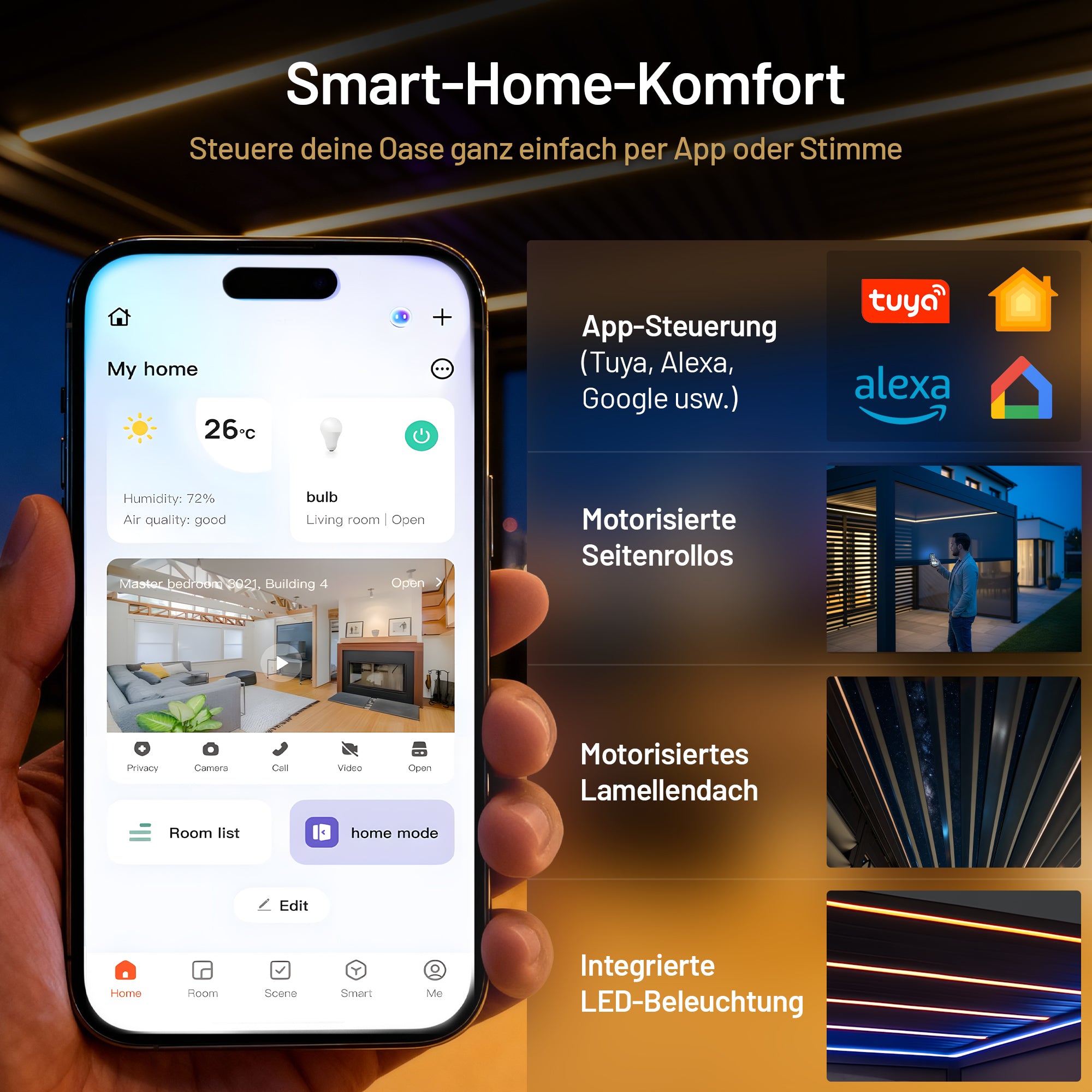 Alle Funktionen der Pergola können bequem per App oder Sprachassistent gesteuert werden. Unterstützt werden Tuya, Smart Life, Google Assistant, Amazon Alexa und Apple Home. Auch Rollos, Lichtfarben, Helligkeit, Lamellenposition und Timer lassen sich individuell programmieren.