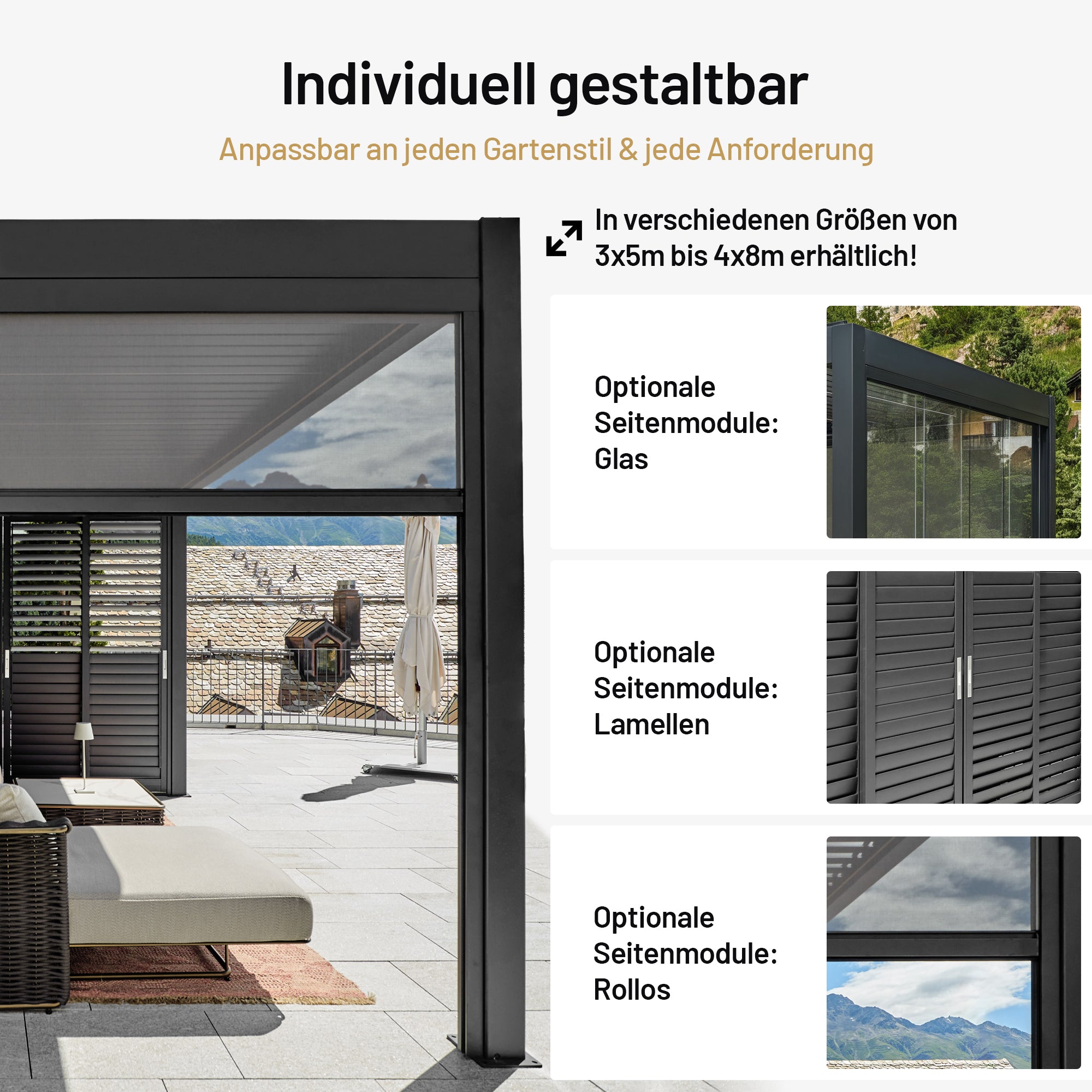 • Erweiterbar mit Seitenwänden, Glas- und Lamellenmodulen