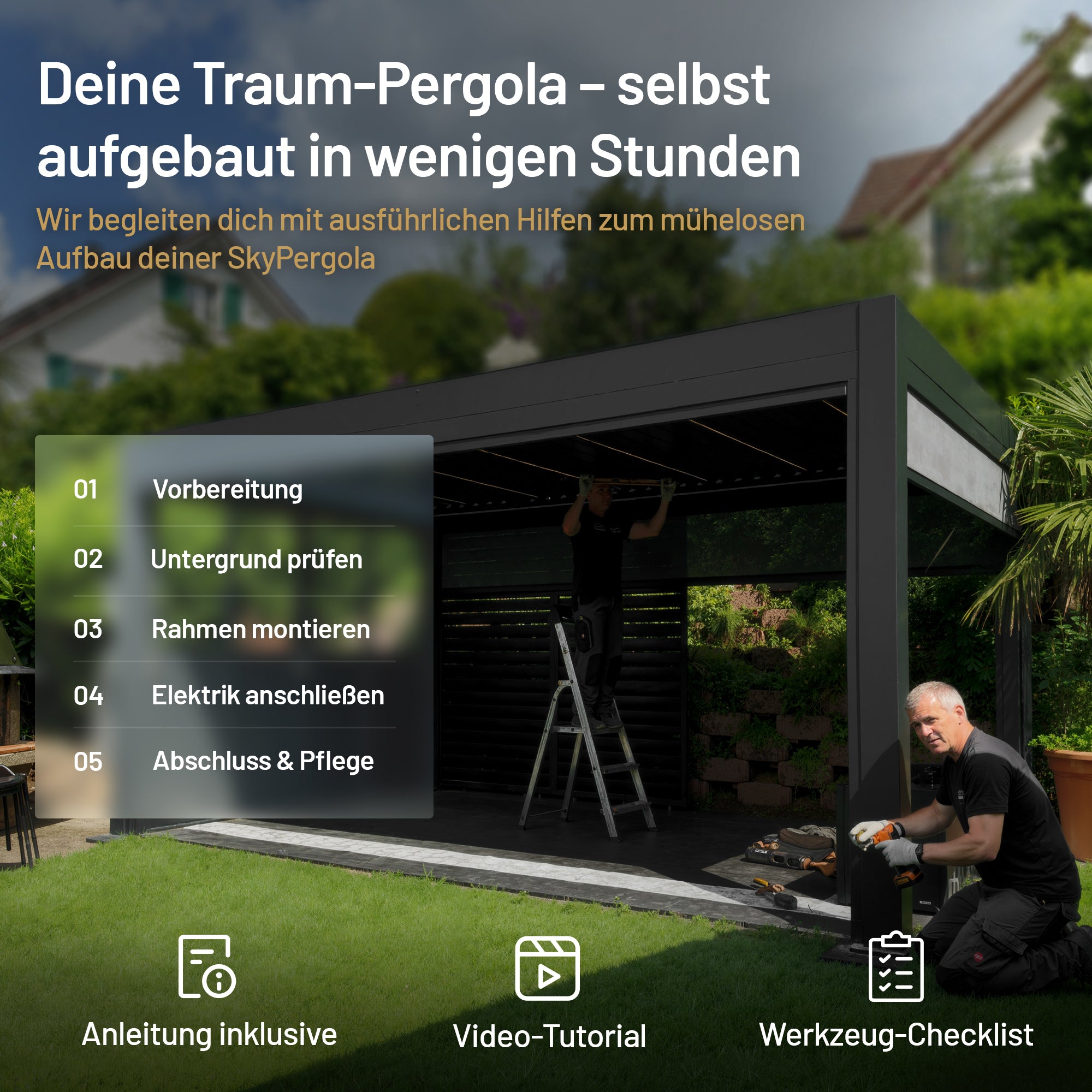 Möchtest du deine Pergola selbst aufbauen? Kein Problem. Die Pergola ist so konzipiert, dass sie auch ohne handwerkliche Erfahrung leicht zu montieren ist. Dank ausführlicher Anleitungen (ähnlich wie bei IKEA), mehrsprachiger Dokumentation und Video-Tutorials gelingt die Montage Schritt für Schritt. Alle Anleitungen und Videos findest du unter: Anleitungen