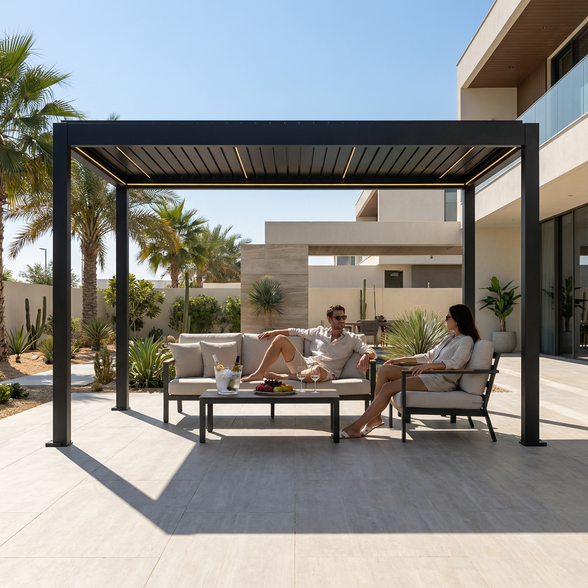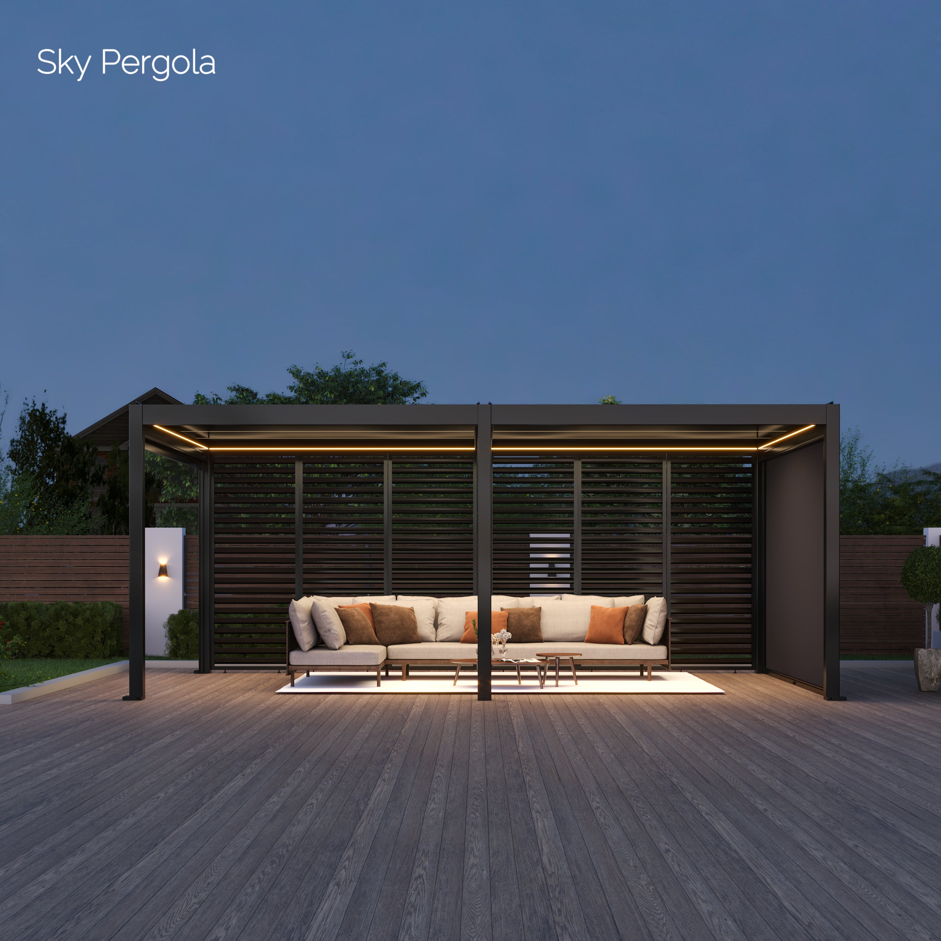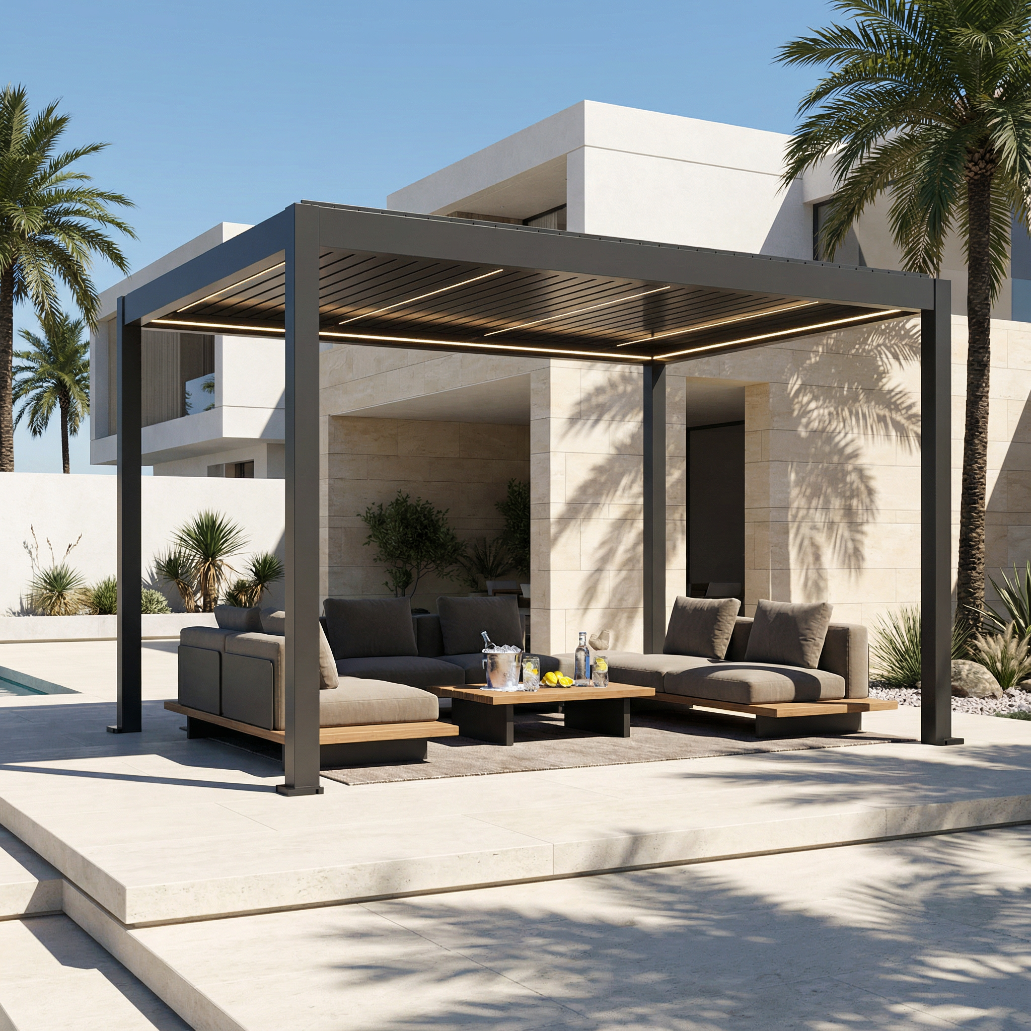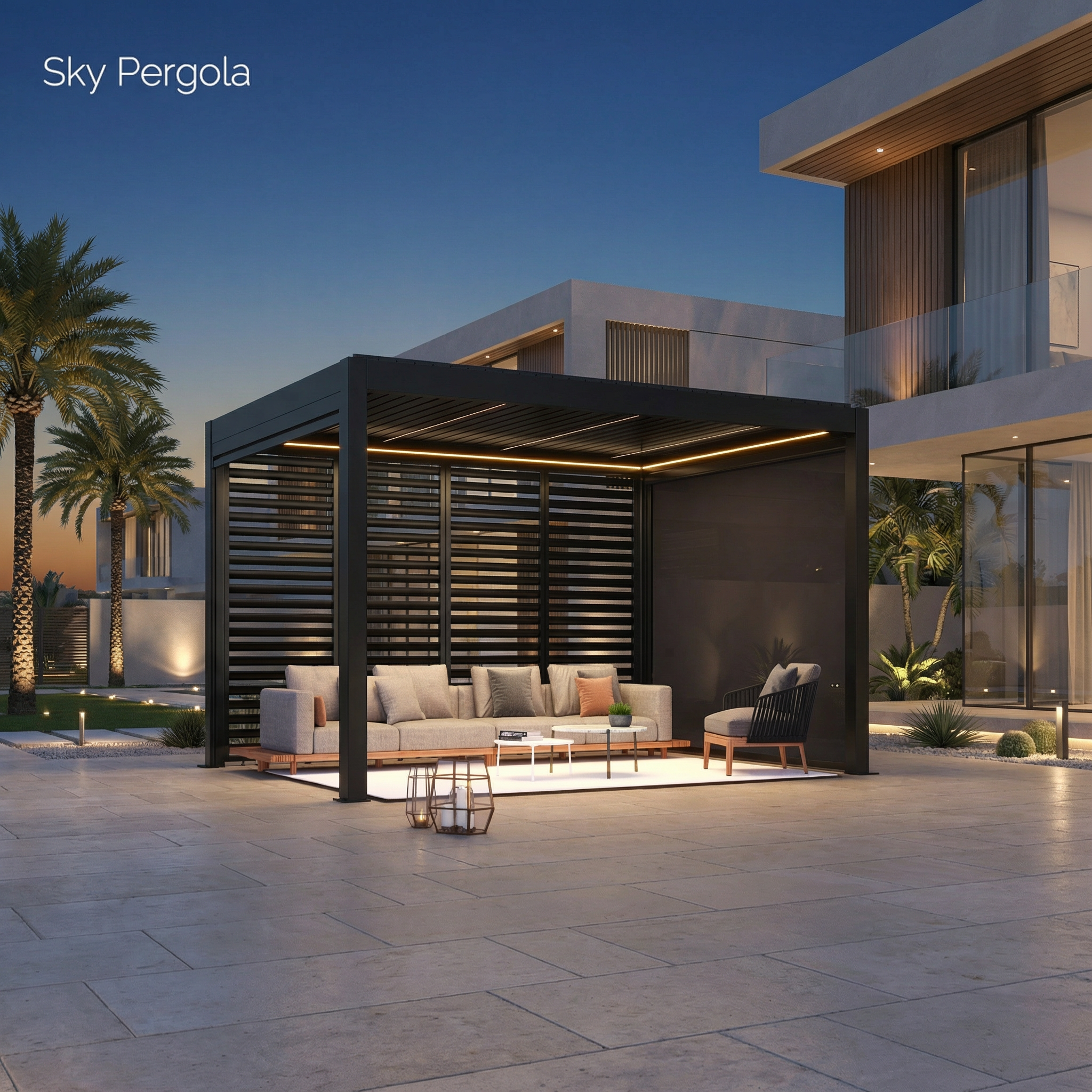 SkyPergola-Modelle sind mit einem durchdachten Lamellendach ausgestattet, das je nach Ausführung manuell oder elektrisch geöffnet und geschlossen werden kann. So lässt sich der Lichteinfall und die Beschattung individuell regulieren. Die integrierte Konstruktion sorgt für zuverlässigen Schutz vor intensiver Sonneneinstrahlung und schafft einen angenehm schattigen Rückzugsort – ideal für das Leben in warmen und sonnigen Regionen wie Dubai.