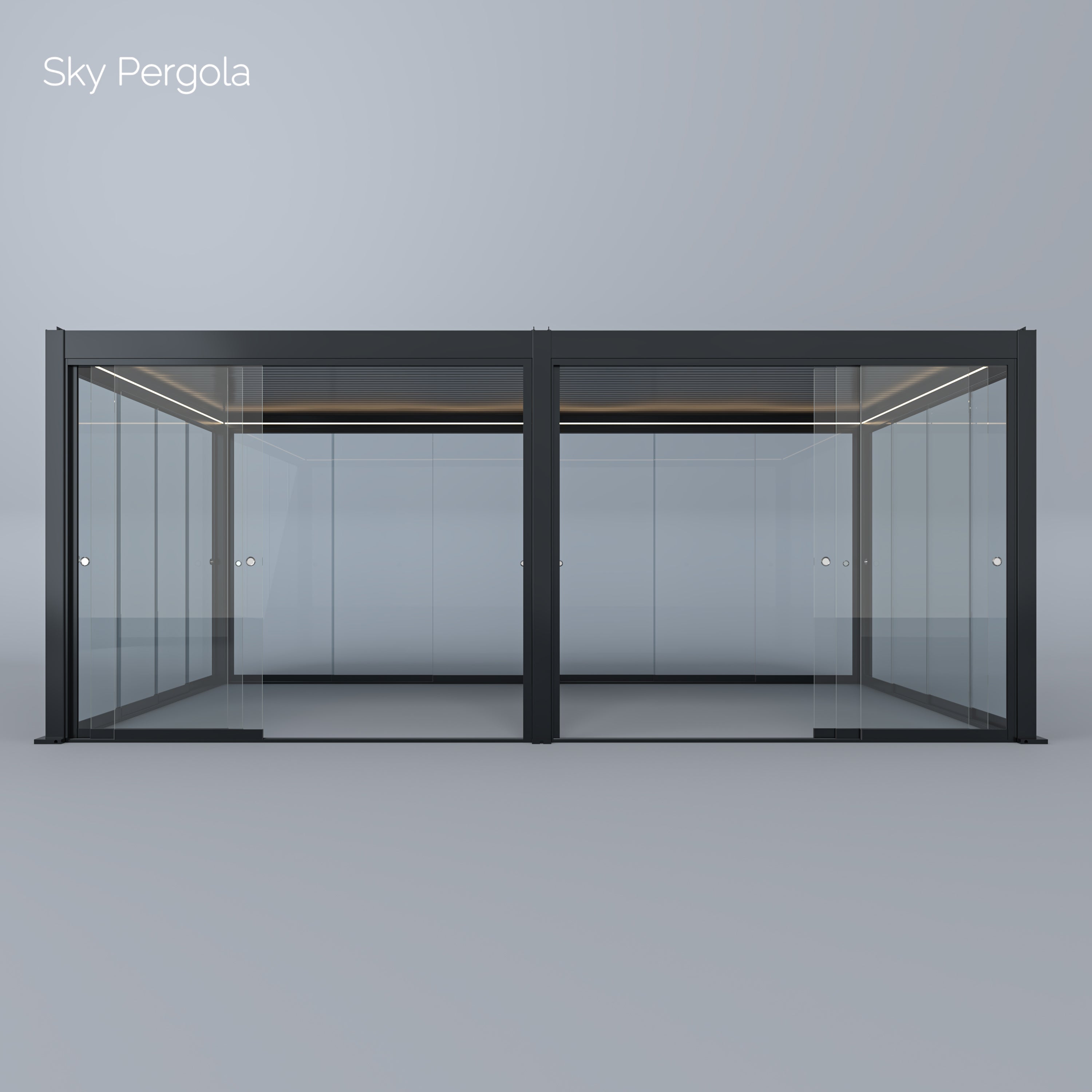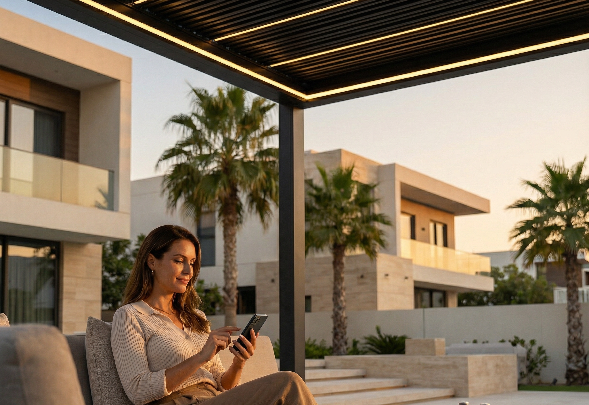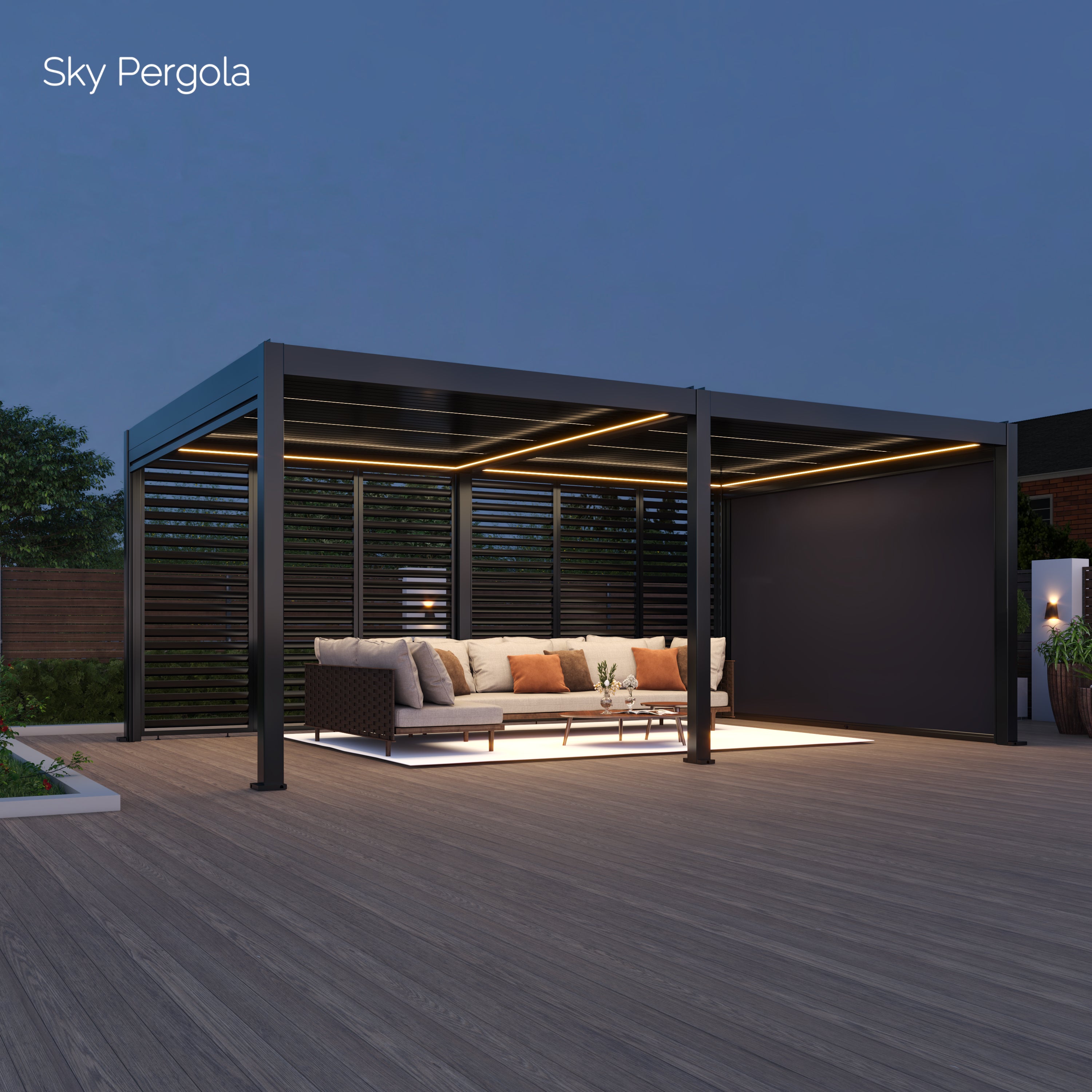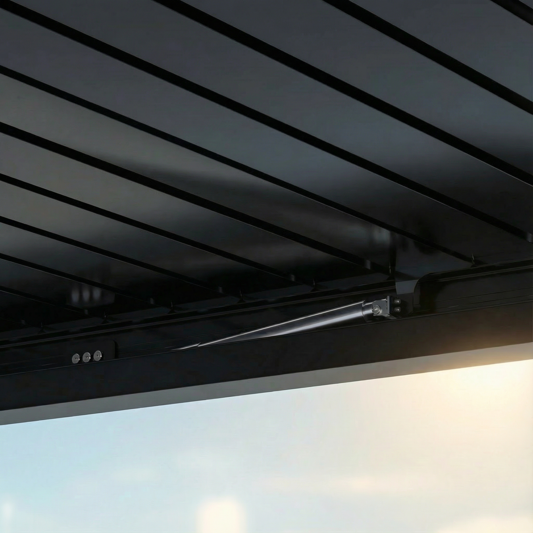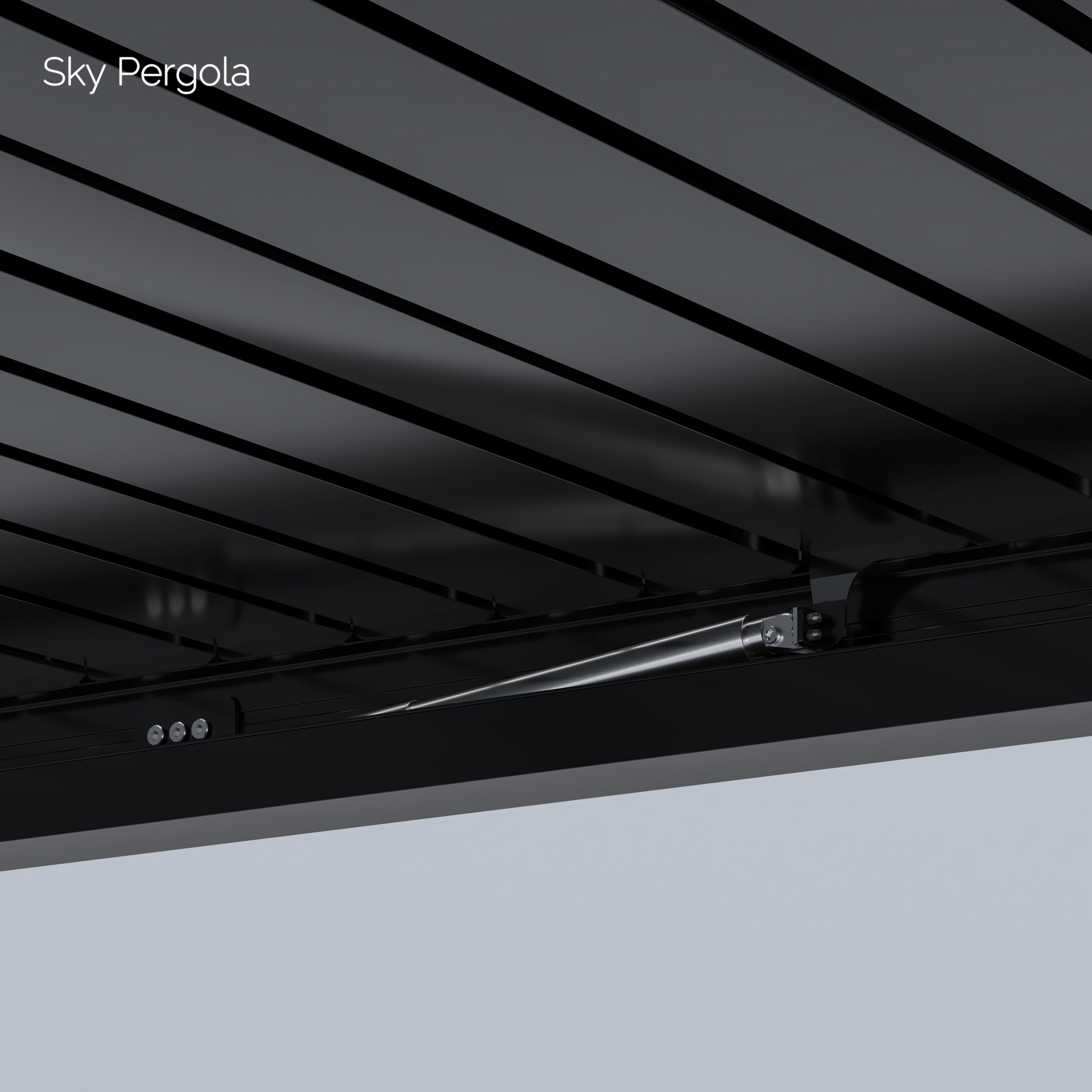 SkyPergola-Modelle sind mit einem durchdachten Lamellendach ausgestattet, das je nach Ausführung manuell oder elektrisch geöffnet und geschlossen werden kann. So lässt sich der Lichteinfall und die Beschattung individuell regulieren. Die integrierte Konstruktion sorgt für zuverlässigen Schutz vor intensiver Sonneneinstrahlung und schafft einen angenehm schattigen Rückzugsort – ideal für das Leben in warmen und sonnigen Regionen wie Dubai.