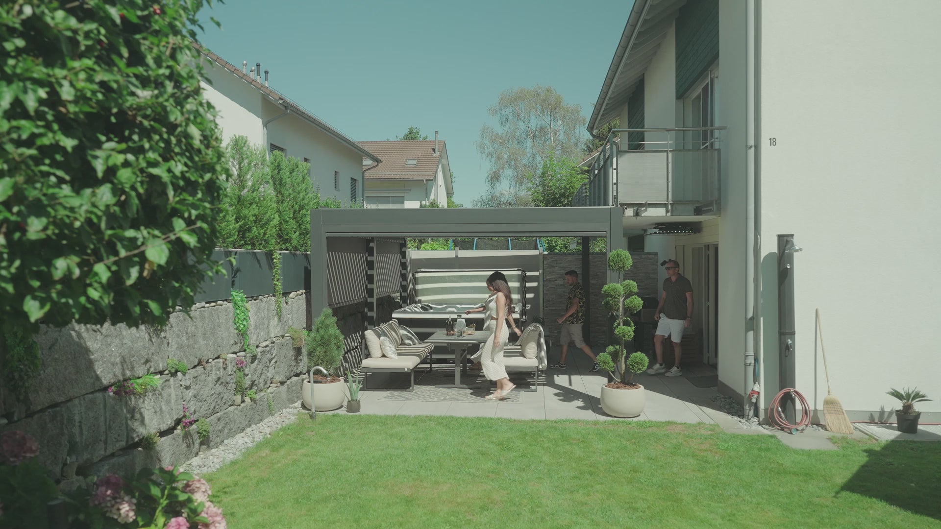 Motorisiertes LamellendachDas Dach der Pergola ist vollständig motorisiert und lässt sich stufenlos öffnen und schliessen. Die Bedienung erfolgt geräuscharm und präzise – ideal, um jederzeit die perfekte Mischung aus Licht, Schatten und Belüftung zu schaffen.