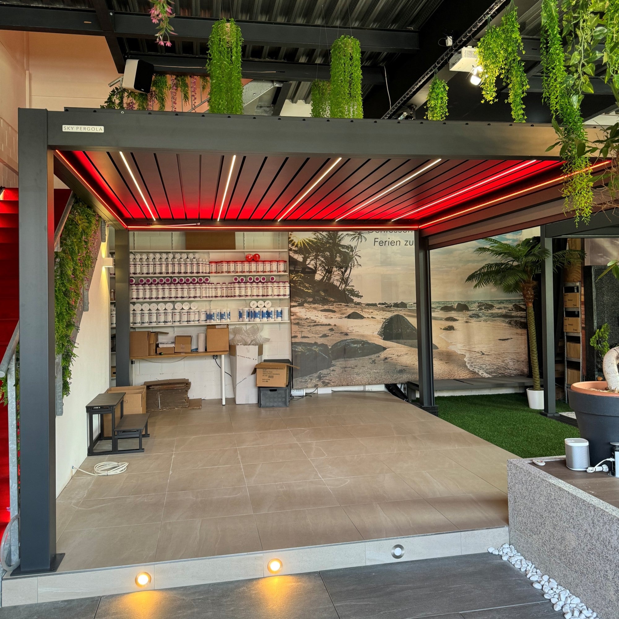 Unsere Sky Pergola Modelle sind je nach Modell für Schneelasten zwischen 50 kg/m² und 150 kg/m² konzipiert. In alpinen Regionen oder bei starkem Schneefall empfehlen wir, die Lamellen geöffnet zu lassen, damit der Schnee ungehindert durchfallen kann und keine übermässige Last auf dem Dach entsteht.