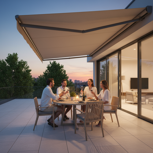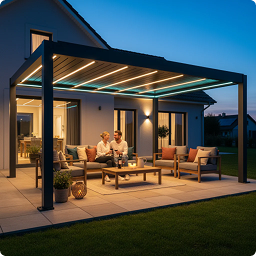 An Ihrer Sky Pergola können Sie verschiedenes praktisches Zubehör anbringen, um Komfort und Funktionalität weiter zu erhöhen. Dazu zählen feste oder verschiebbare Lamellenwände als seitlicher Sicht- und Windschutz, elegante Glaswände für transparenten Wetterschutz sowie Seitenrollos, die je nach Wunsch manuell oder motorisiert bedient werden können. Für angenehme Temperaturen auch an kühleren Tagen lassen sich Infrarot-Heizstrahler montieren, während Ventilatoren an heissen Sommertagen für eine bessere Luftzirkulation sorgen. Zusätzlich kann ein Regensensor integriert werden, der die Lamellen bei einsetzendem Regen automatisch schliesst. So wird Ihre Sky Pergola zu einem ganzjährig nutzbaren Rückzugsort im Aussenbereich.
