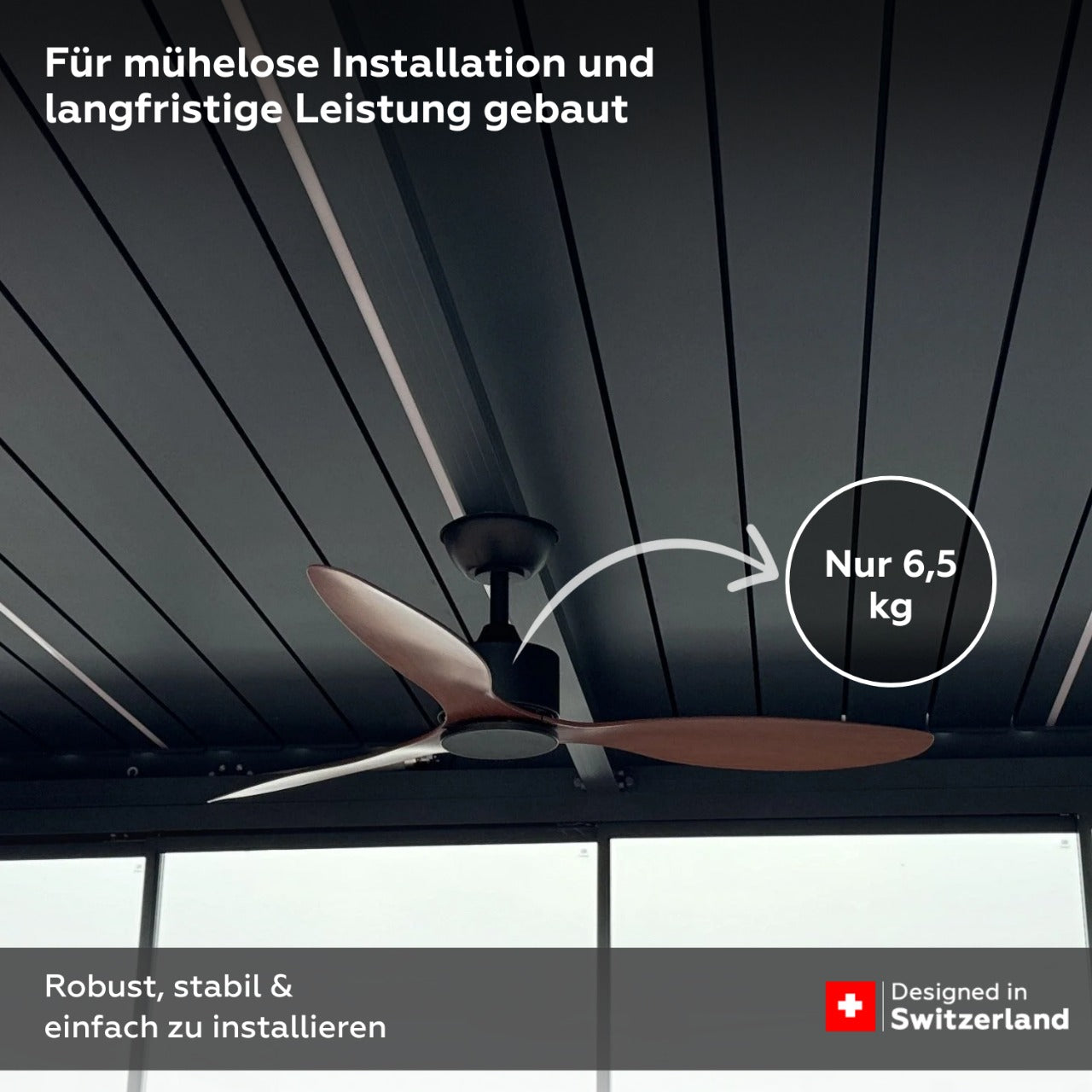 Leichtgewicht mit 6,5 kg: Trotz seiner Größe ist der Sky Pergola Ventilator leicht und einfach zu installieren. Seine robuste Konstruktion garantiert Stabilität und Langlebigkeit.