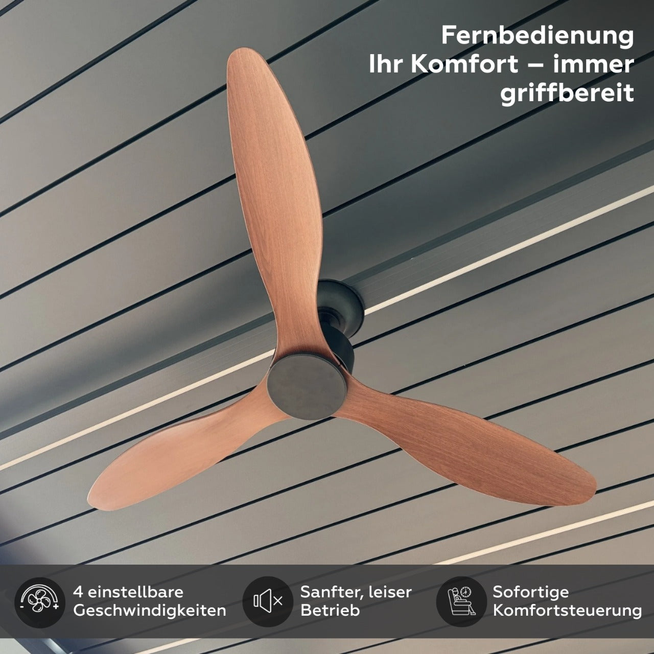 Hochwertiges Holzdesign: Der Ventilator ist aus edlem, hochwertigem Holz gefertigt, das nicht nur für Langlebigkeit sorgt, sondern auch optisch ein Highlight darstellt. Er fügt sich nahtlos in das Design Ihrer Pergola ein und verleiht ihr eine elegante Note.