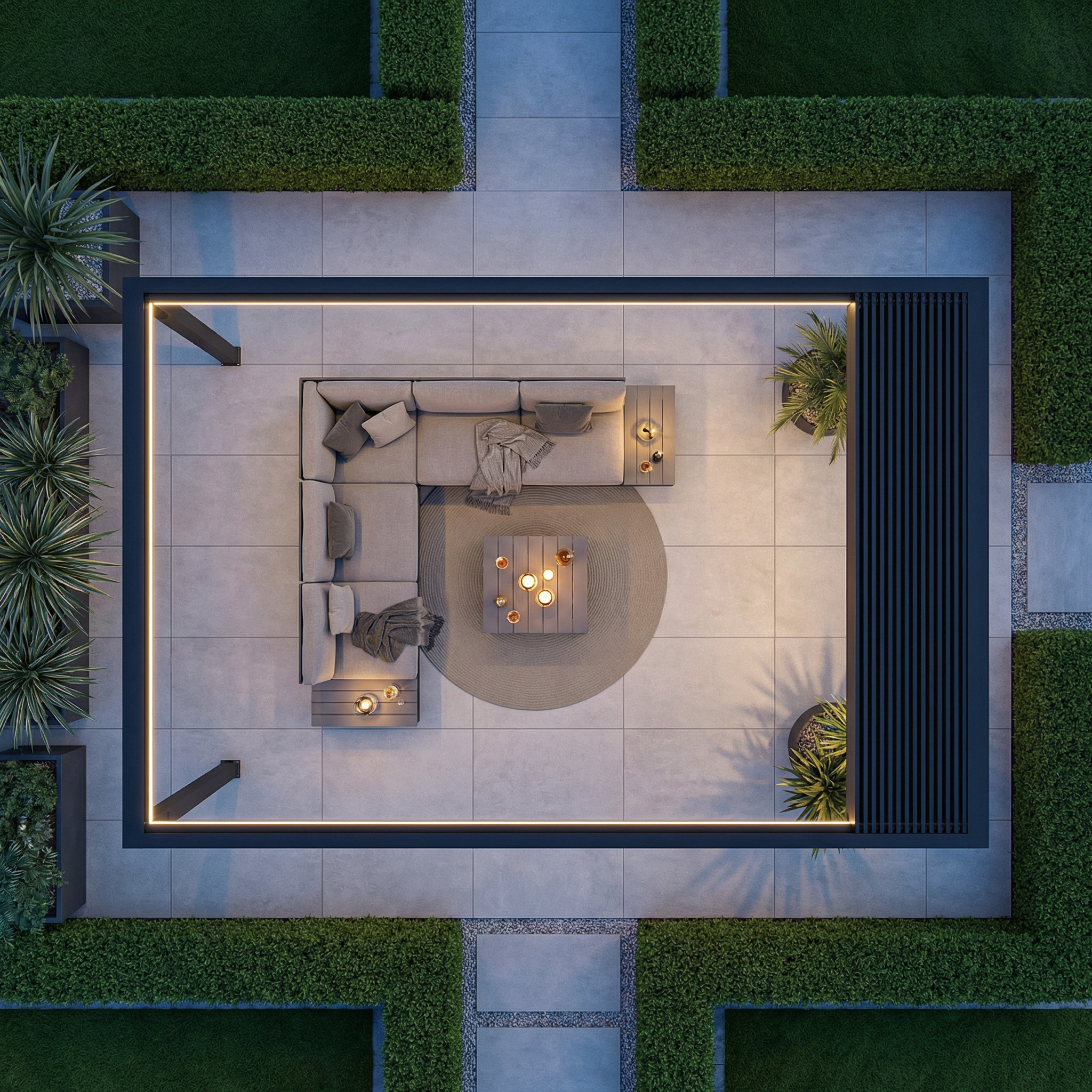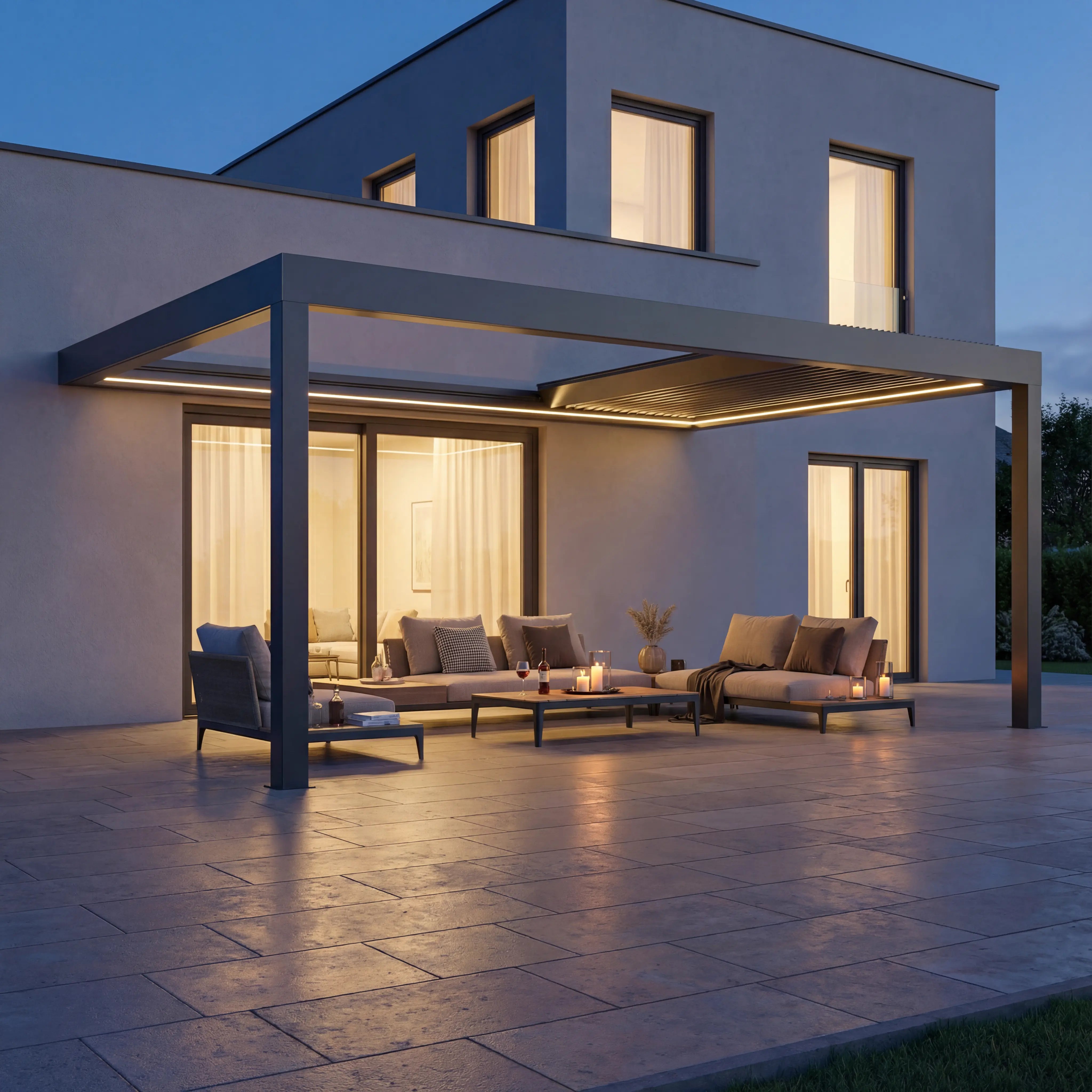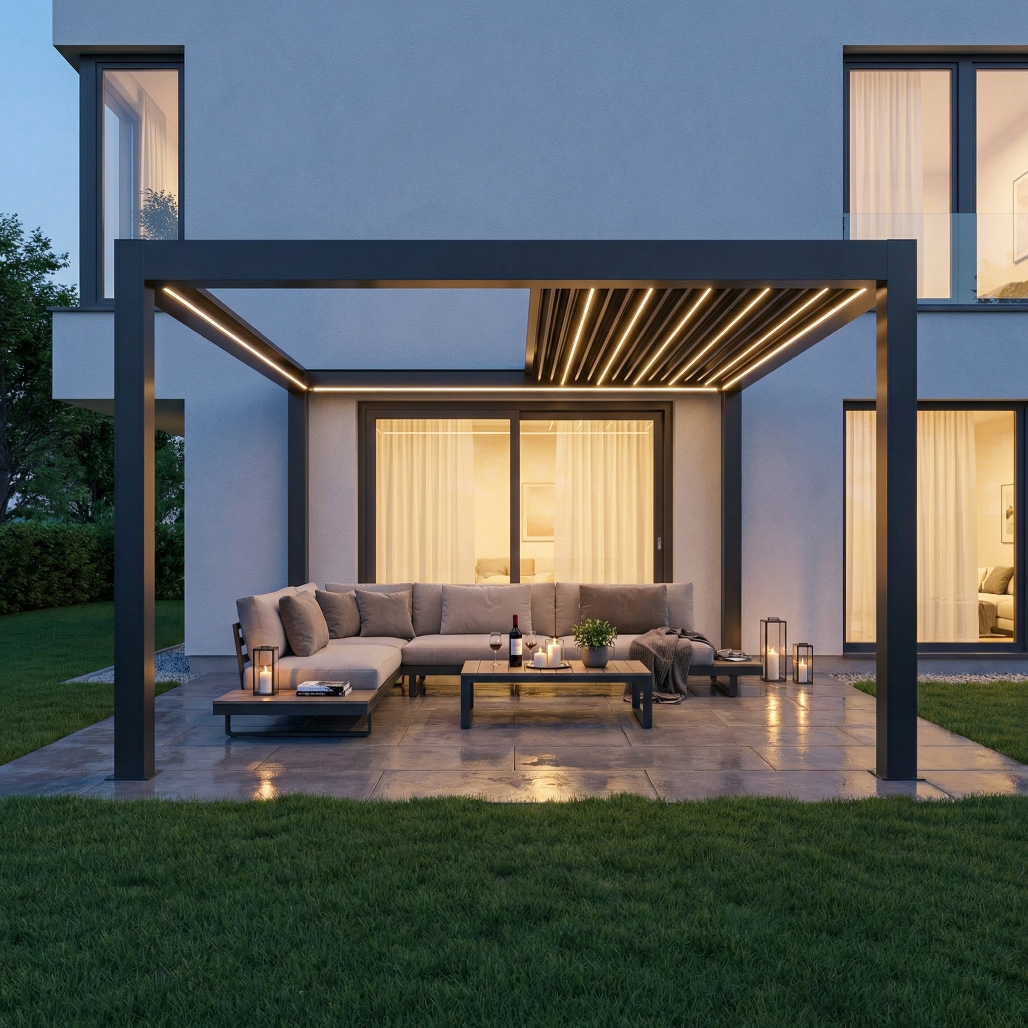 Mit den Sky Pergola Seitenrollos, Lamellenwänden oder Glaswänden können die Seiten flexibel geschlossen und der Wind effektiv reduziert werden – für noch mehr Komfort bei jedem Wetter.