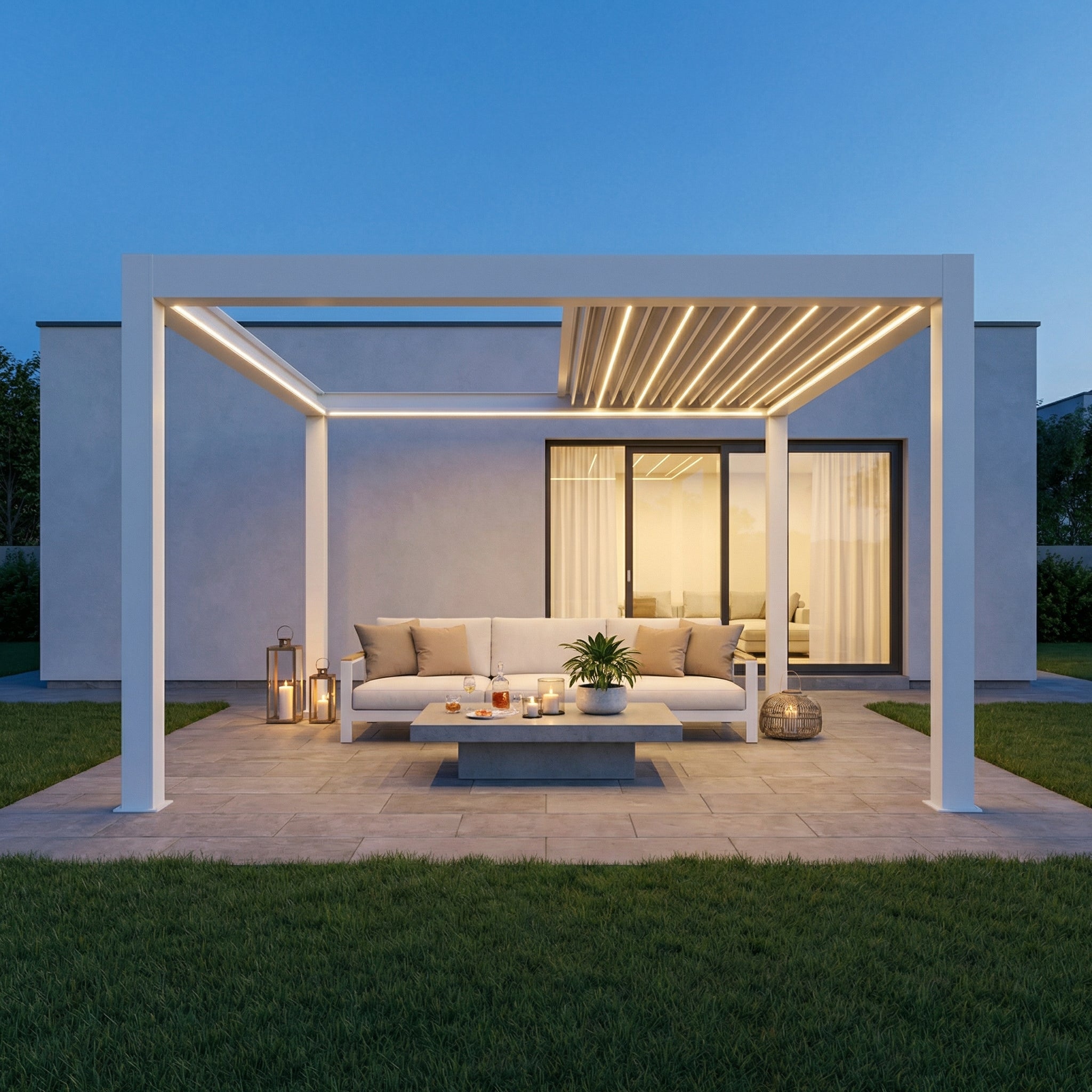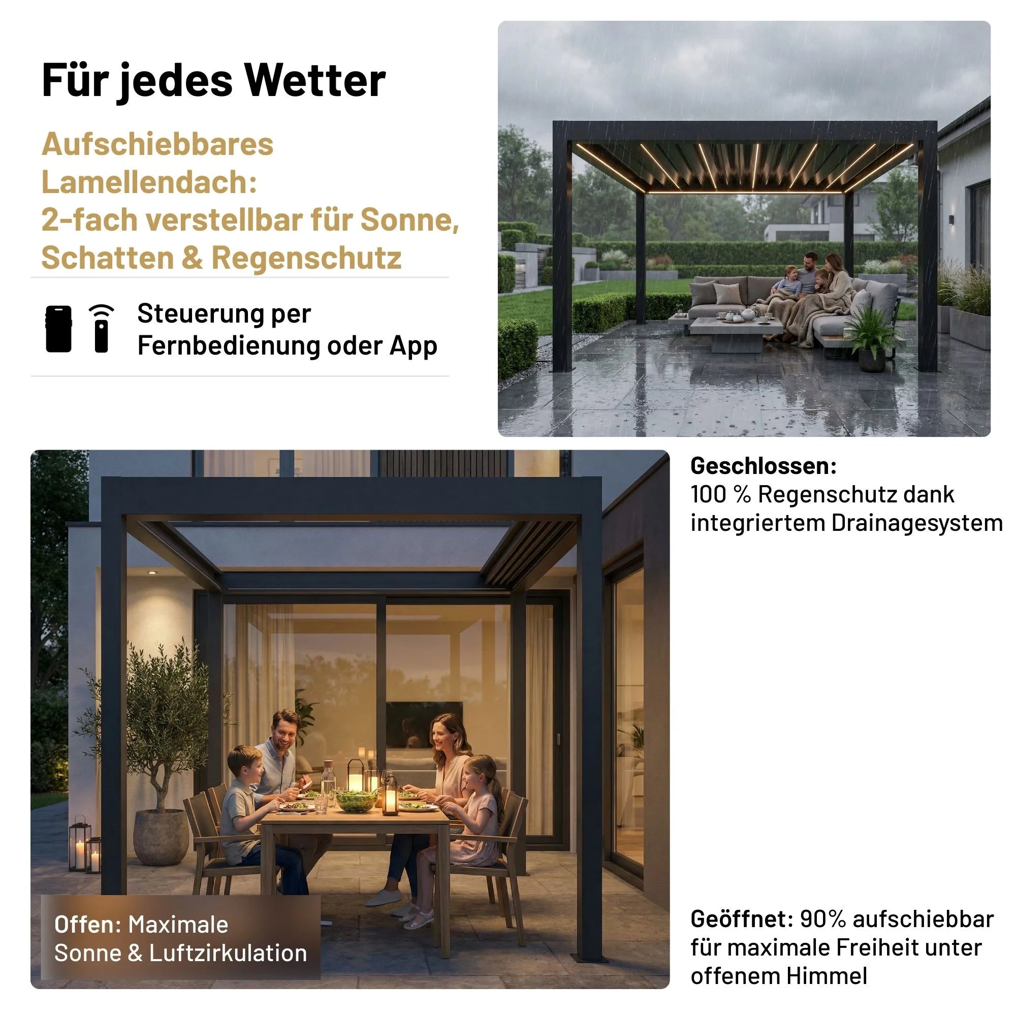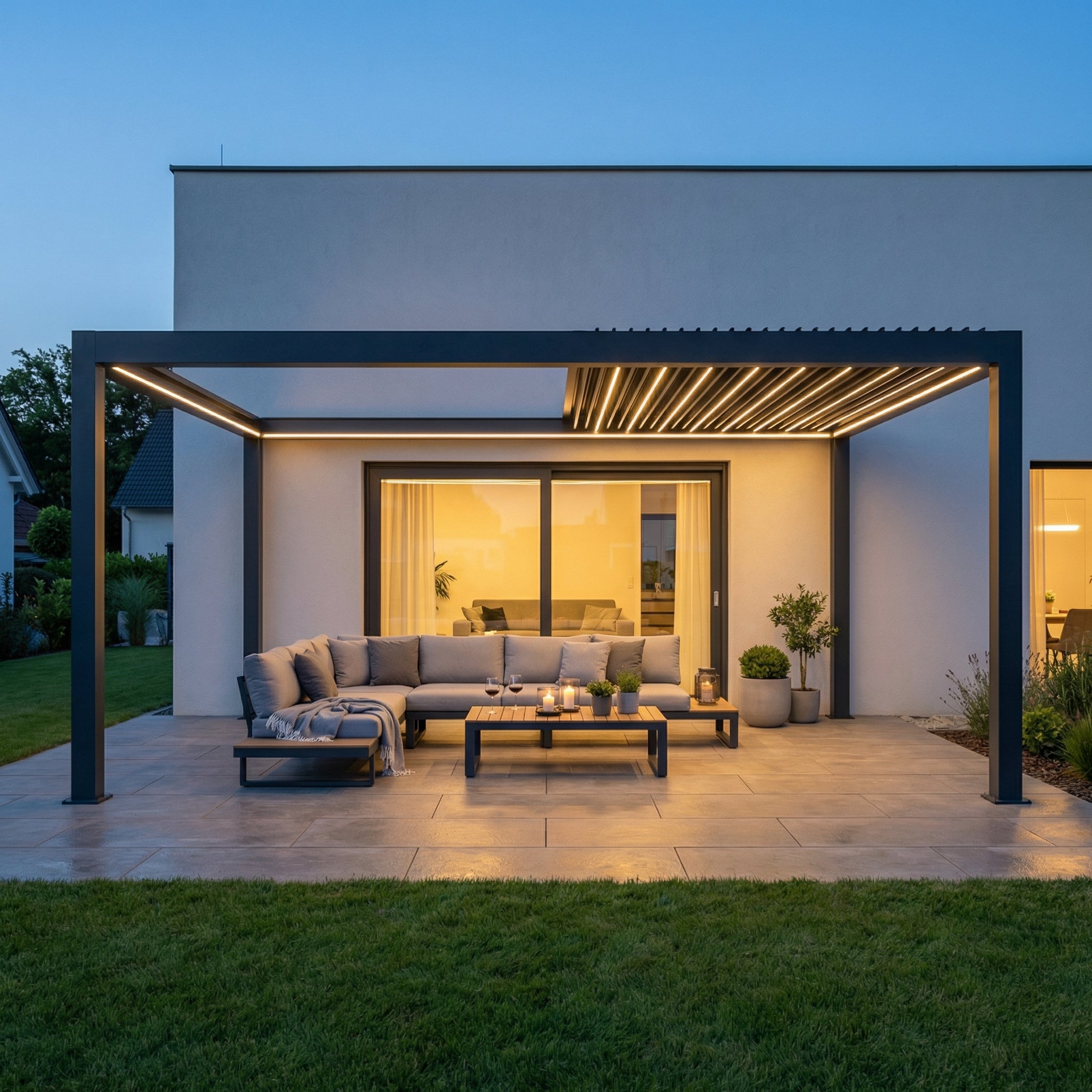 An Ihrer Sky Pergola können Sie verschiedenes praktisches Zubehör anbringen, um Komfort und Funktionalität weiter zu erhöhen. Dazu zählen feste oder verschiebbare Lamellenwände als seitlicher Sicht- und Windschutz, elegante Glaswände für transparenten Wetterschutz sowie Seitenrollos, die je nach Wunsch manuell oder motorisiert bedient werden können. Für angenehme Temperaturen auch an kühleren Tagen lassen sich Infrarot-Heizstrahler montieren, während Ventilatoren an heissen Sommertagen für eine bessere Luftzirkulation sorgen. Zusätzlich kann ein Regensensor integriert werden, der die Lamellen bei einsetzendem Regen automatisch schliesst. So wird Ihre Sky Pergola zu einem ganzjährig nutzbaren Rückzugsort im Aussenbereich.