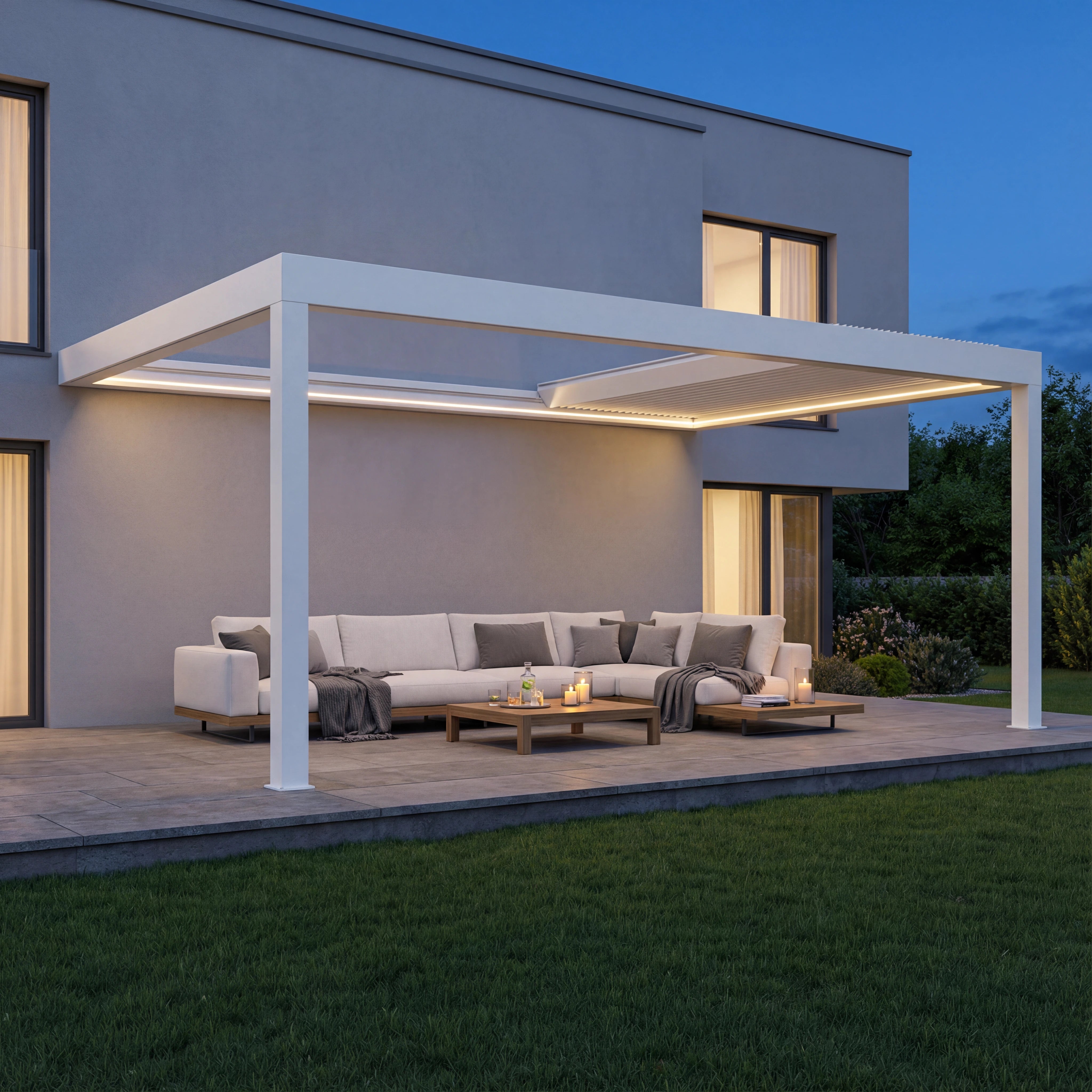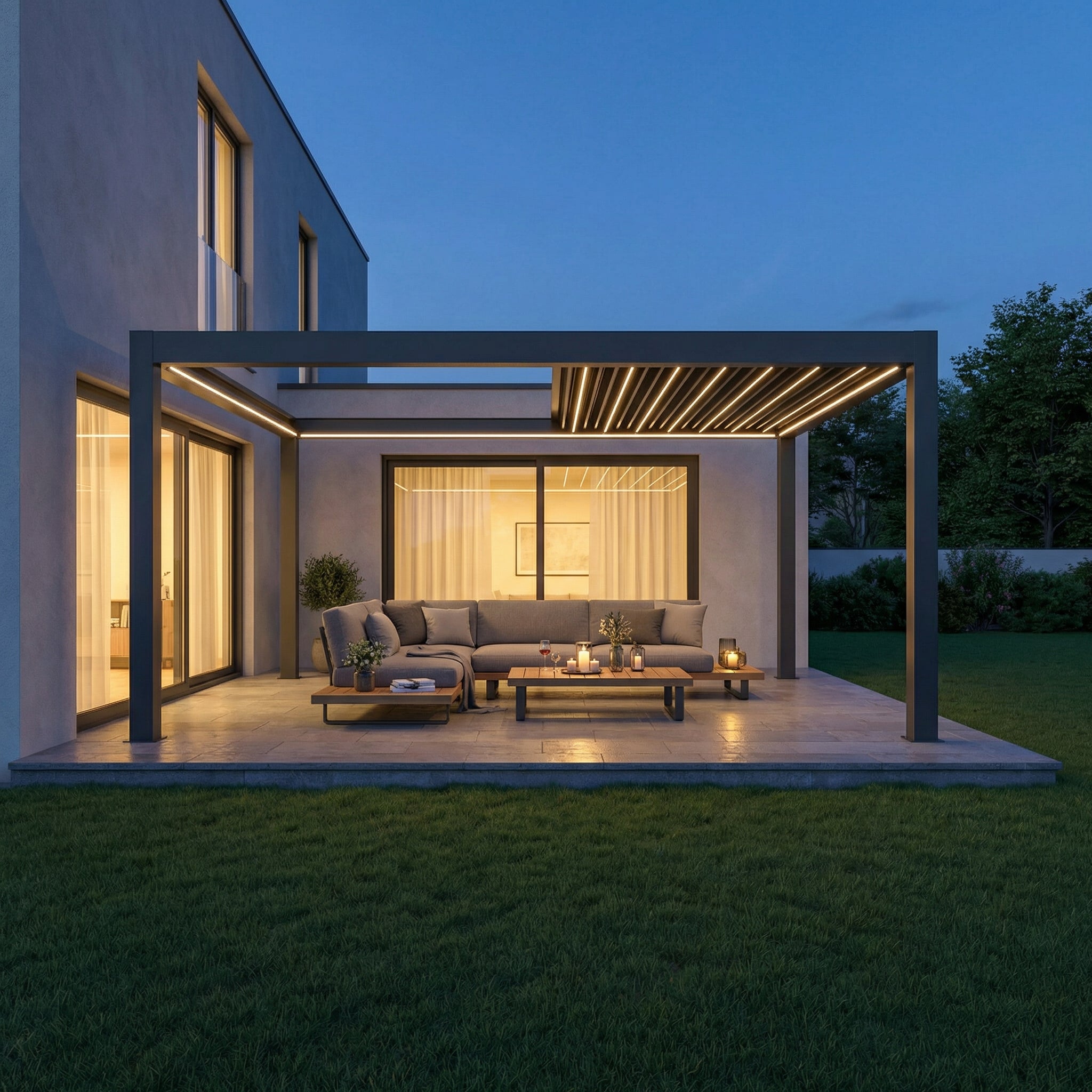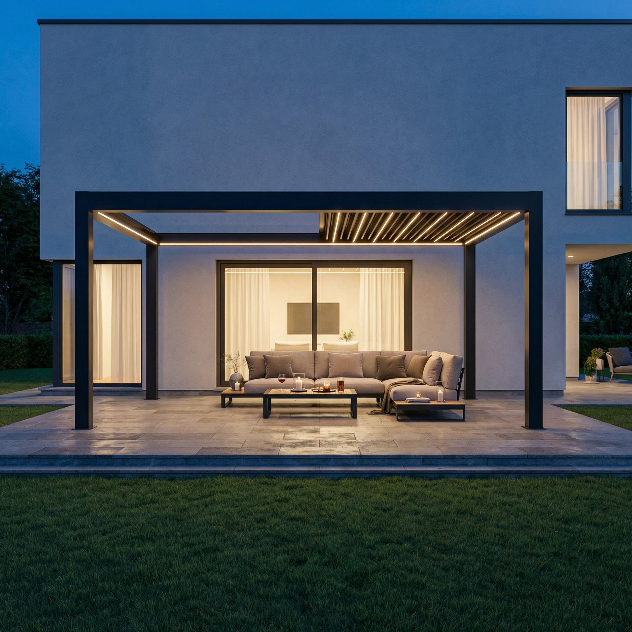 An Ihrer Sky Pergola können Sie verschiedenes praktisches Zubehör anbringen, um Komfort und Funktionalität weiter zu erhöhen. Dazu zählen feste oder verschiebbare Lamellenwände als seitlicher Sicht- und Windschutz, elegante Glaswände für transparenten Wetterschutz sowie Seitenrollos, die je nach Wunsch manuell oder motorisiert bedient werden können. Für angenehme Temperaturen auch an kühleren Tagen lassen sich Infrarot-Heizstrahler montieren, während Ventilatoren an heissen Sommertagen für eine bessere Luftzirkulation sorgen. Zusätzlich kann ein Regensensor integriert werden, der die Lamellen bei einsetzendem Regen automatisch schliesst. So wird Ihre Sky Pergola zu einem ganzjährig nutzbaren Rückzugsort im Aussenbereich.