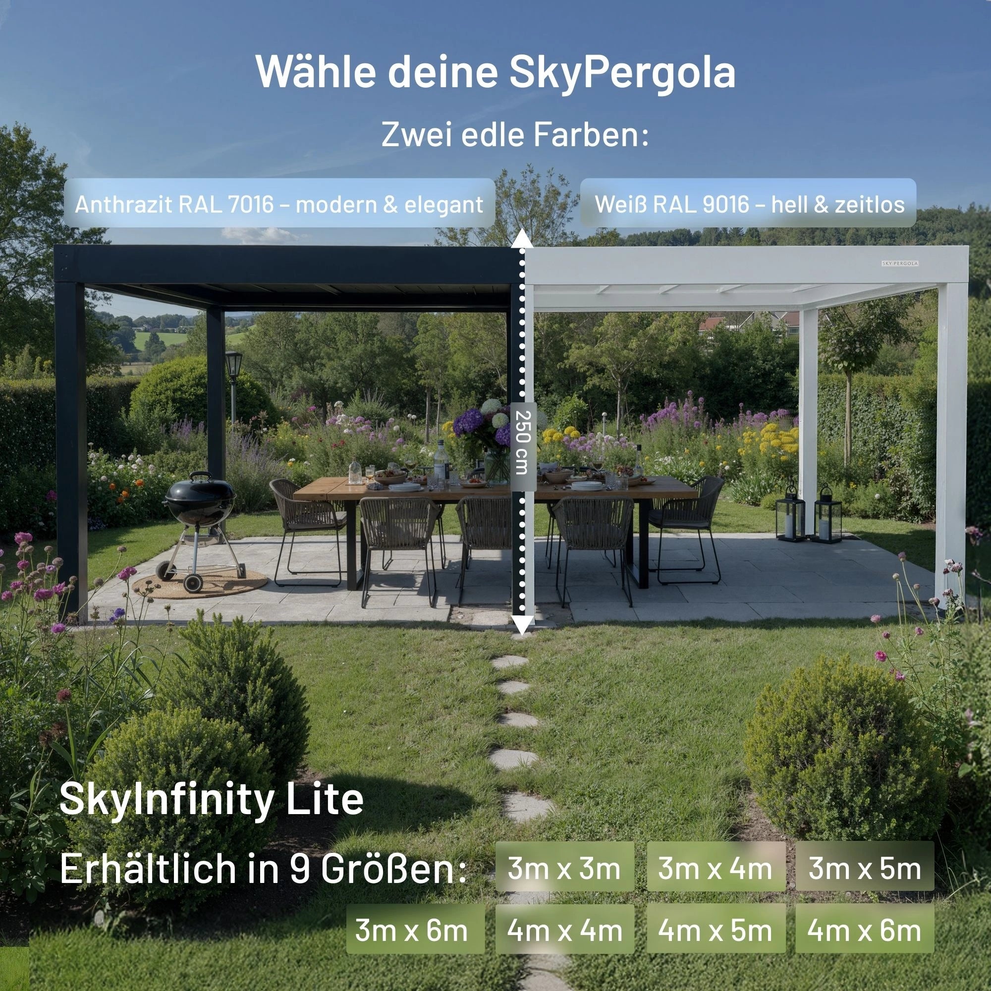 Die Standardhöhe der Sky Pergola beträgt 250 cm. Bei geöffneten Lamellen kommen zusätzlich ca. 8 cm hinzu, sodass die Gesamthöhe in geöffnetem Zustand ca. 258 cm beträgt.