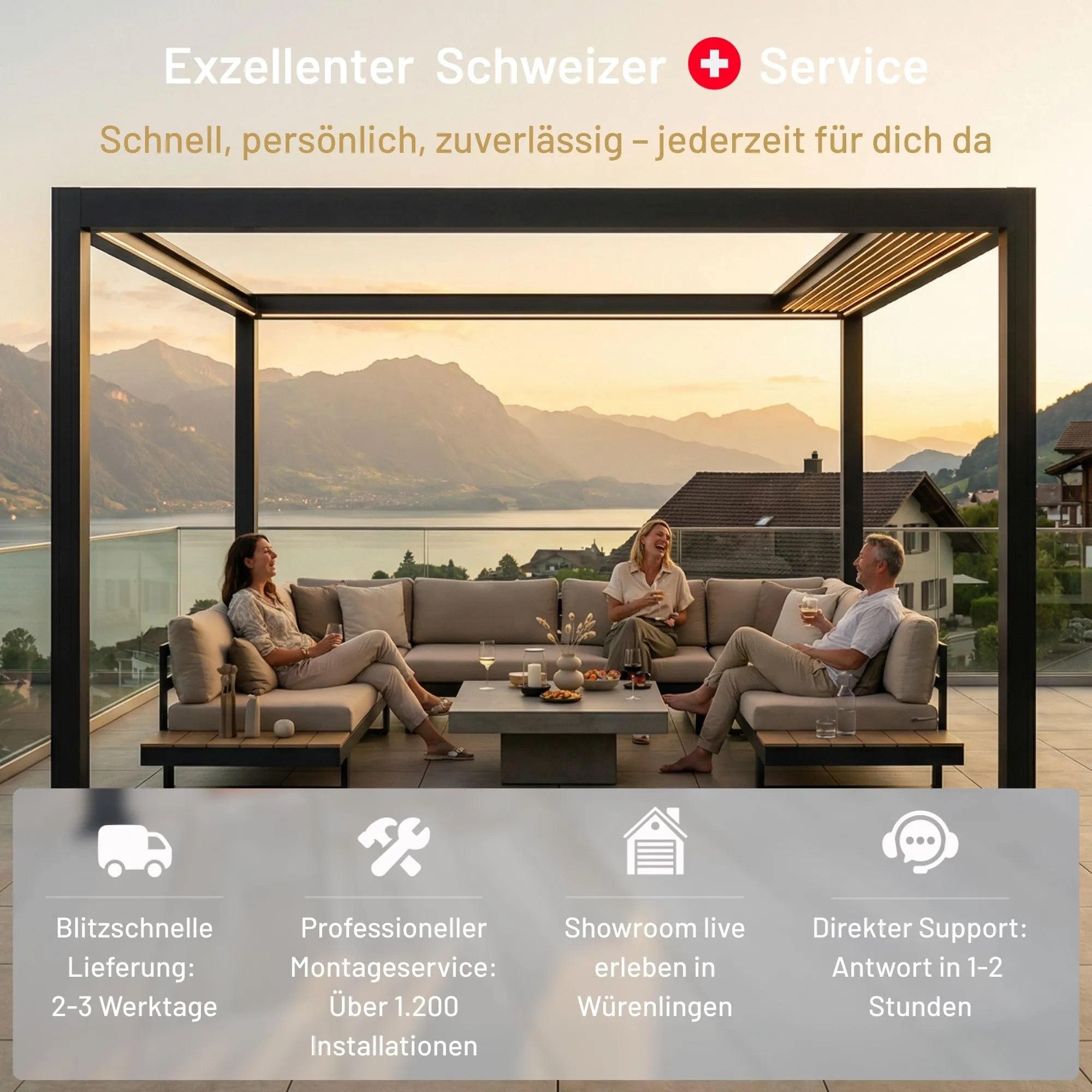 Die Eigenmontage ist dennoch problemlos möglich – unsere Pergolen sind bewusst so konstruiert, dass der Aufbau auch selbst durchgeführt werden kann. Viele unserer Kunden entscheiden sich für die Selbstmontage und sparen dadurch erhebliche Kosten, denn professionelle Montagen können in der Schweiz schnell teuer werden. Bei Fragen unterstützen wir Sie selbstverständlich jederzeit.